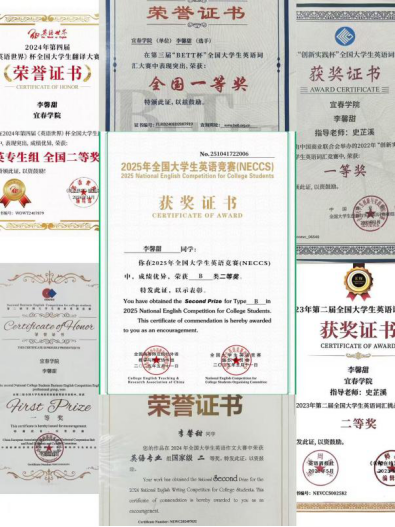 学科竞赛中,她实力突出,斩获 2025 年全国大学生英语竞赛 B 类二等奖、第三届 “BETT 杯” 全国大学生英语词汇大赛一等奖、2024 年全国大学生英语作文大赛二等奖等国家级、省级、校级奖项,这些荣誉是她专业能力的证明,更是持续奋进的勋章。