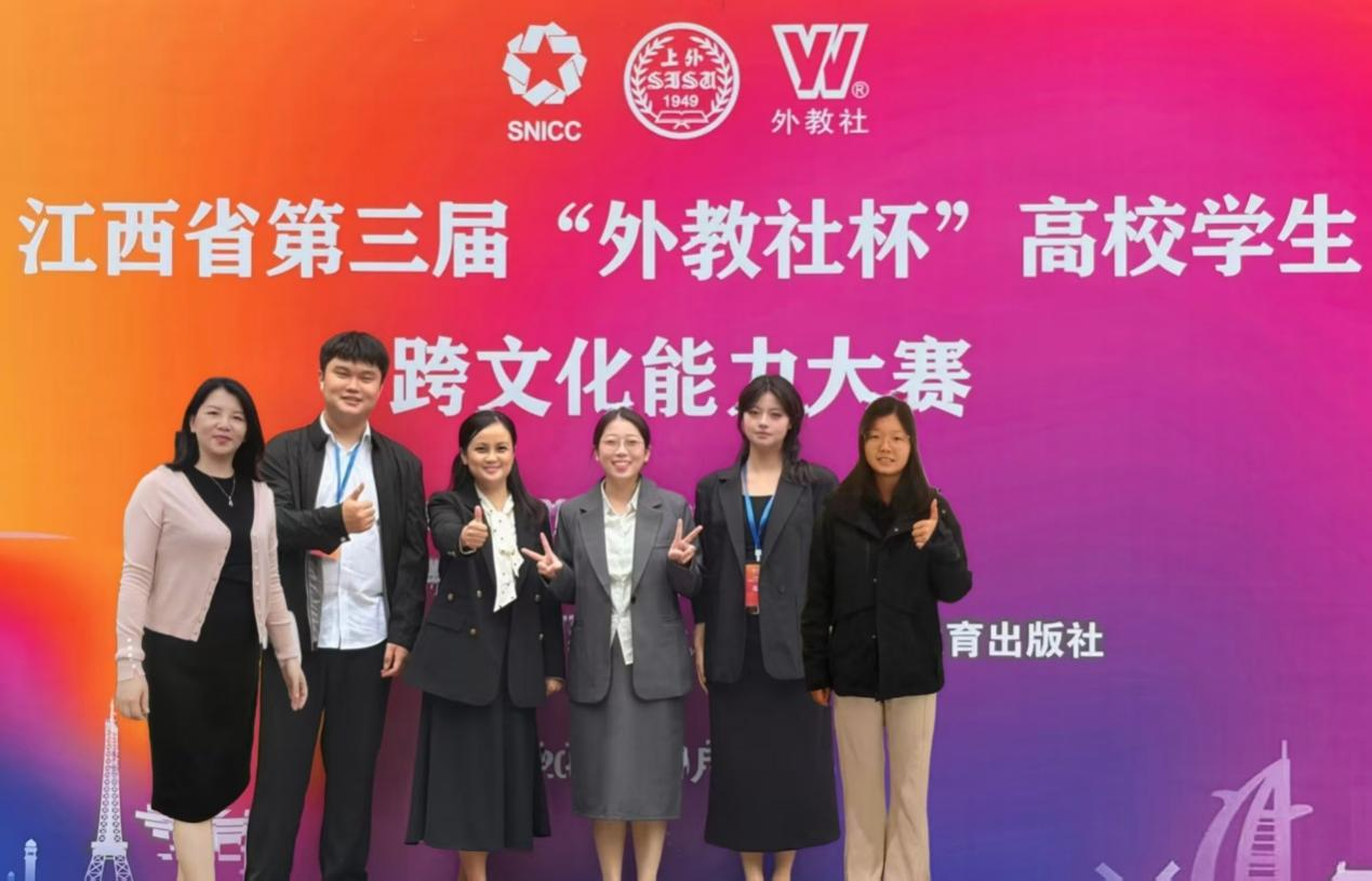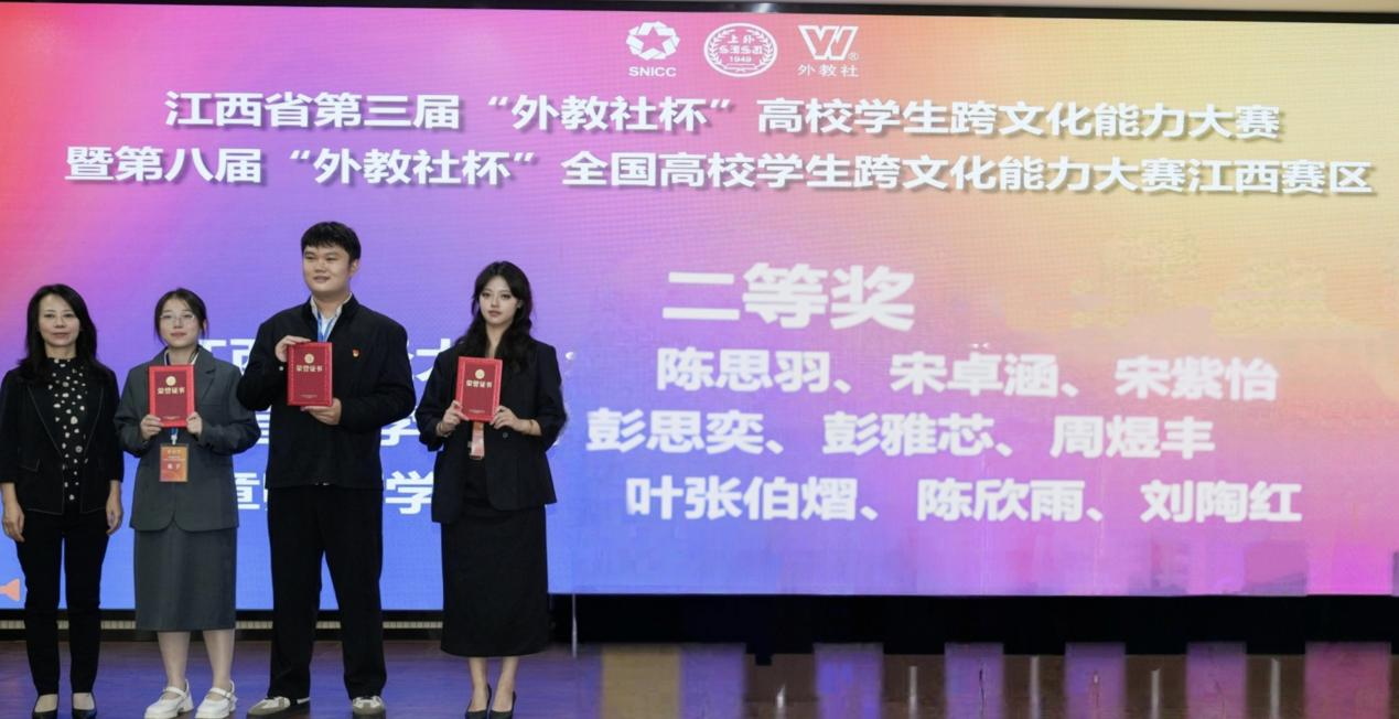 2025年10月18日,江西省第三届“外教社杯”高校学生跨文化能力大赛暨第八届“外教社杯”全国高校学生跨文化能力大江西赛区在江西农业大学举行校由23 级翻译专业彭思奕、23 级中文教育专业彭雅芯、24 级临床医学专业周煜丰组成的参赛团队,凭借出色表现先以复赛小组第一晋级决赛,最终斩获全省二等奖,充分彰显了我校学子优秀的跨文化素养与广阔的国际视野。