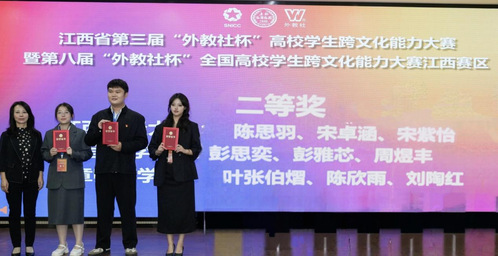 2025年10月18日,江西省第三届“外教社杯”高校学生跨文化能力大赛暨第八届“外教社杯”全国高校学生跨文化能力大赛(江西赛区)在江西农业大学举行。我校由23 级翻译专业彭思奕、23 级中文教育专业彭雅芯、24 级临床医学专业周煜丰组成的参赛团队,凭借出色表现先以复赛小组第一晋级决赛,最终斩获全省二等奖,充分彰显了我校学子优秀的跨文化素养与广阔的国际视野。