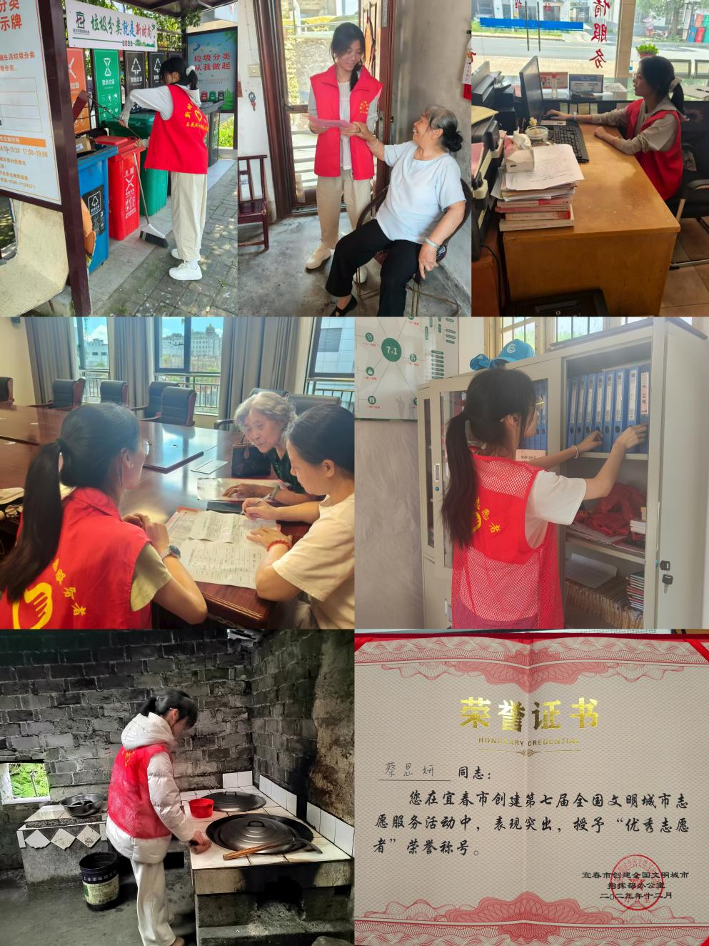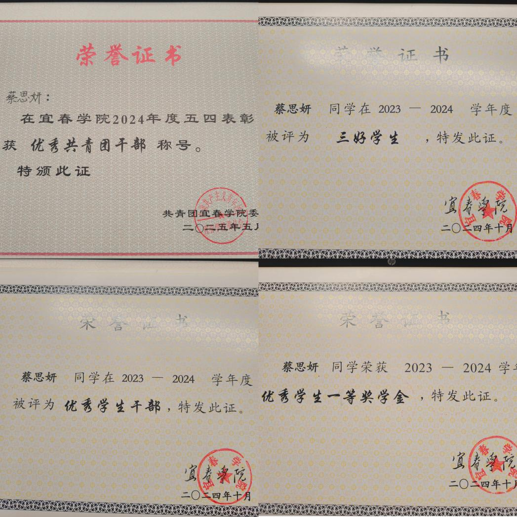 蔡思妍同学的大学生活不止于学习与工作,更在志愿服务、创新创业领域熠熠生辉她热心公益,累计服务时长超800小时2023年宜春市创建第七届全国文明城市志愿服务活动中,被授予“优秀志愿者”称号,用行动传递温暖,践行“奉献、友爱、互助、进步”的志愿精神。她勇于探索,负责的创新创业项目在学校尚能众创空间成功挂牌入孵,11届中国国际大学生创新大赛院级选拔赛中获二等奖,展现出强劲的创新思维与实践能力。同时,她还在外国语学院“英语书法比赛”中获三等奖,彰显了她在专业领域外的多元发展。