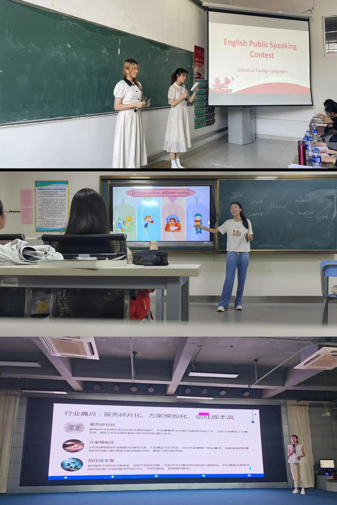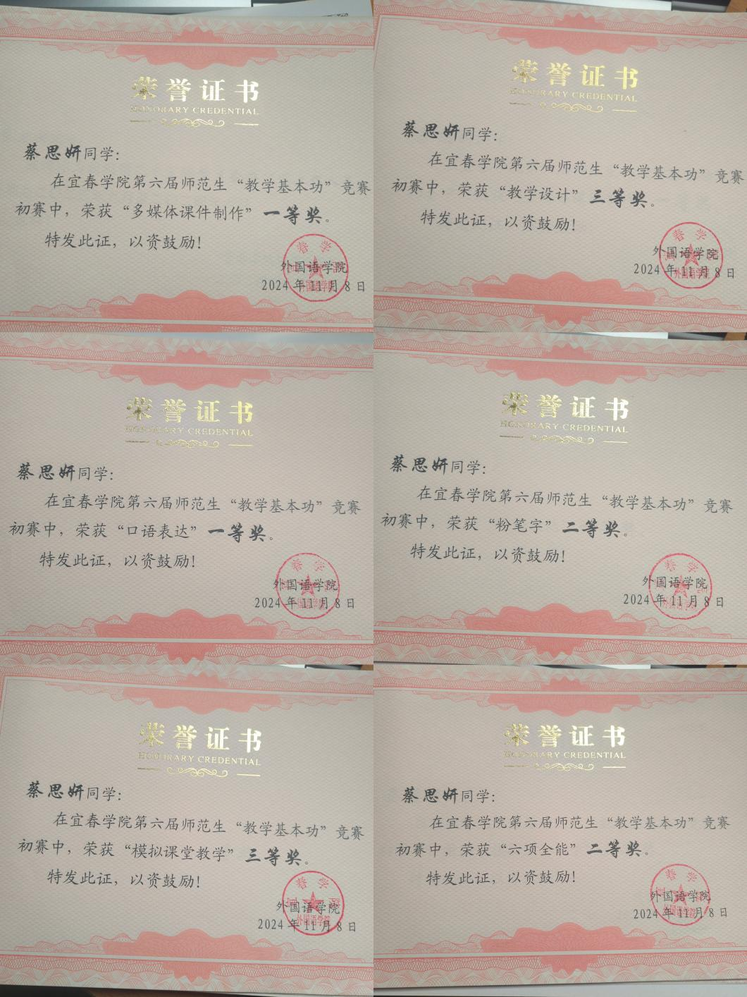在专业能力提升上,她全面发展、多点突破学科竞赛方面,她在翻译、教学、创新思维等领域屡创佳绩,获第三届“融贯古今”大学生翻译百科知识竞赛全国三等奖、第二届全国大学生教育教学能力大赛小学组一等奖、全国大学生创新创业能力大赛创新思维赛一等奖、第六届全国高校创新英语挑战赛综合能力赛(英语专业组)二等奖等多项国家级、校级奖项。师范专业技能方面,她在师范生教学基本功大赛中表现亮眼,荣获“六项全能”二等奖,其中“口语表达”一等奖、“多媒体课件制作”一等奖、“粉笔字”二等奖,“模拟课堂教学”“教学设计”分获三、三等奖,充分展现了扎实的教学素养。