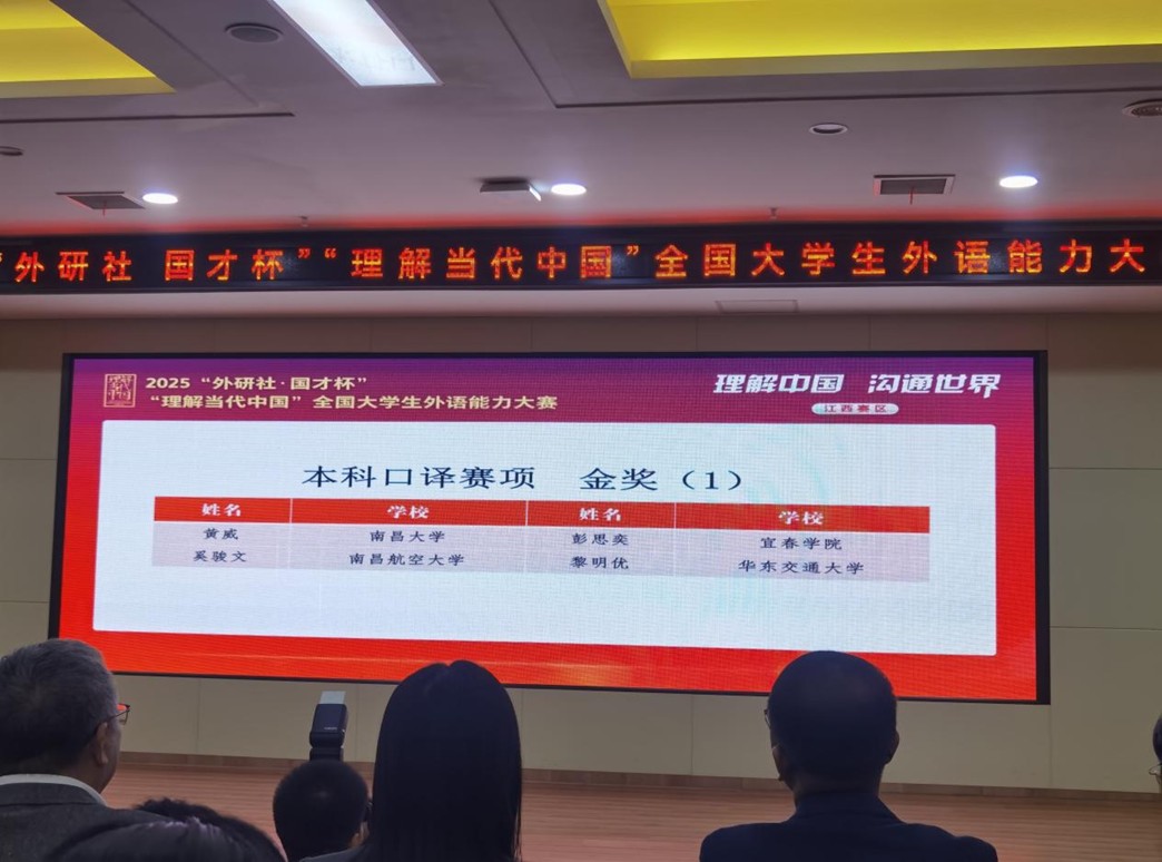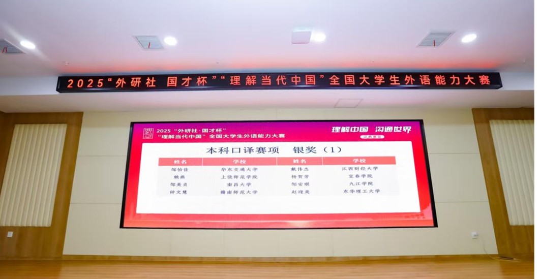 2025年11月2日,2025“外研社·国才杯”“理解当代中国”全国大学生外语能力大赛(江西赛区)在江西中医药大学成功举办。我院23级翻译2班彭思奕、23级翻译1班杨贺芳两位同学,在全省37所高校近80名本科生和研究生同台竞技中脱颖而出,双双晋级决赛,最终斩获亮眼成绩 —— 杨贺芳荣获江西省银奖;彭思奕以全省第三名的优异表现摘得金奖,将代表我校晋级全国总决赛。