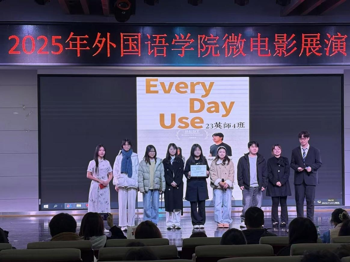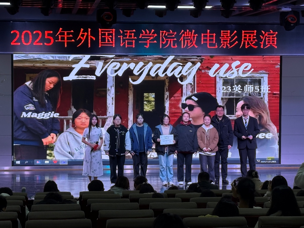 11 月 21 日下午,外国语学院省一流课程《高级英语》特色思政活动 ——微电影创作展示活动在青年发展中心顺利举行。本次活动以 “文化与传承” 为核心思政导向,依托课文Everyday Use开展多元创作,2023级相关专业所有教学班级全员参与,副院长袁翔华、刘兵飞李慧懿施艳群、聂淑琴、江莉莉、邹文峰、涂斯艺、史芷溪老担任评委并为最佳影片颁奖,活动由学生单湘婷、彭霄主持。