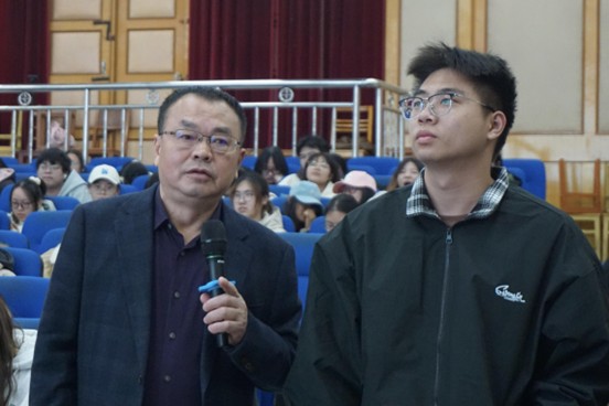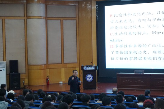 随后,钟鸣博士以“英语词汇的串联记忆与词源解析”为主题展开专题分享。他凭借深厚的语言学素养,融汇个人学术积淀与习得经验,与在场学生进行了多维互动。钟博士以代表性词汇为例,溯源至原始日耳曼语与古英语形态,阐释其语义流变,并融入跨文化语境下的经典表达,生动呈现了“语言知识与文化认知相融合”的词汇研习路径,现场反响热烈,互动氛围浓厚。