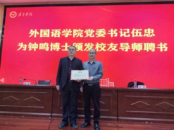 讲坛伊始,外国语学院党委书记伍忠为钟鸣博士颁发“校友导师”聘书。高芸在致辞中表示,校友是学院发展的“见证者”与“同行者”,聘任优秀校友担任导师,既是搭建校友反哺母校的桥梁,也为学生成长提供了“零距离”接触行业榜样的机会。
