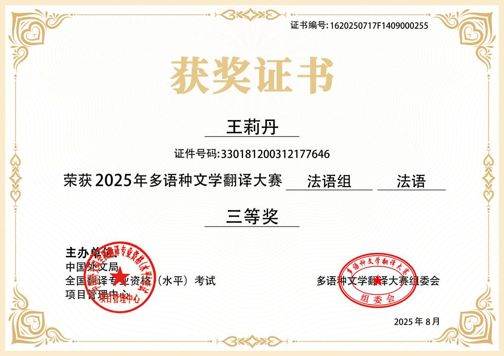 近日,由CATTI中心组织的2025年多语种文学翻译大赛圆满落幕。我院法语专业学子王莉丹凭借深厚的文学素养和卓越的翻译能力,在法语组比赛中脱颖而出,荣获全国三等奖,为学校赢得荣誉。