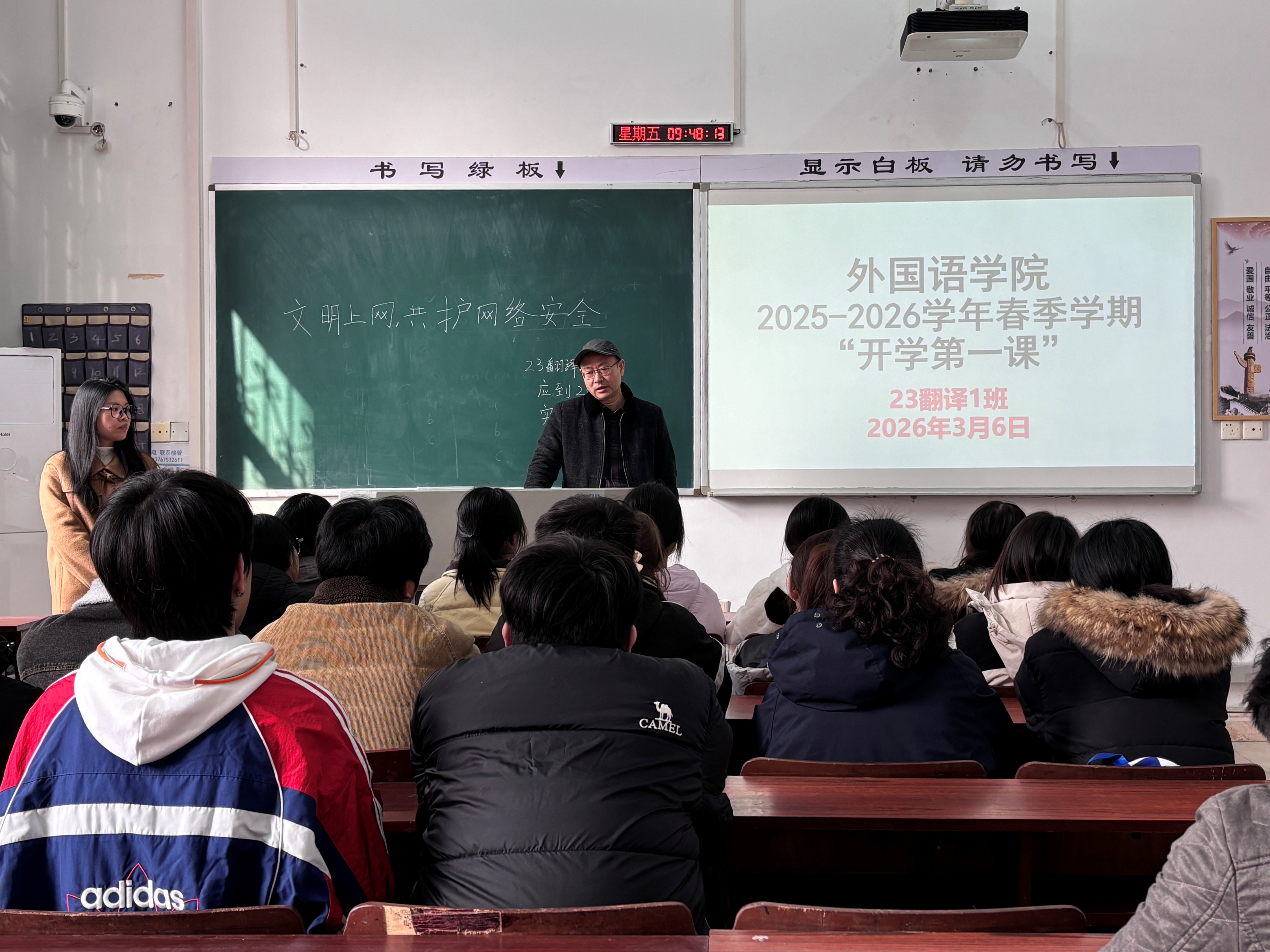 在23翻译1班班会上,院党委书记伍忠强调,网络空间与现实生活紧密相连,同学们要增强辨别能力,自觉抵制不良信息,做到理性发声、文明用网。他结合当前安全形势,提醒大家警惕各类网络陷阱和电信诈骗,牢记防诈骗“八个凡是”原则,切实守护好个人信息和财产安全。此外,针对未来职业发展,他建议同学们尽早做好生涯规划,注重专业技能的提升与实践经验的积累,为将来高质量就业打下坚实基础。