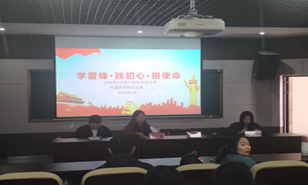 为深入学习贯彻习近平新时代中国特色社会主义思想,全面落实党的二十届四中全会精神,传承弘扬雷锋精神,教育引导党员锤炼党性、践行初心、担当使命,充分发挥先锋模范作用,3月13日,外国语学院学生党支部于人文楼N207开展“学雷锋·践初心·担使命”主题党日活动。党支部全体党员、部分入党积极分子现场参与,在沉浸式学习与分享中让雷锋精神扎根心中、见诸行动。