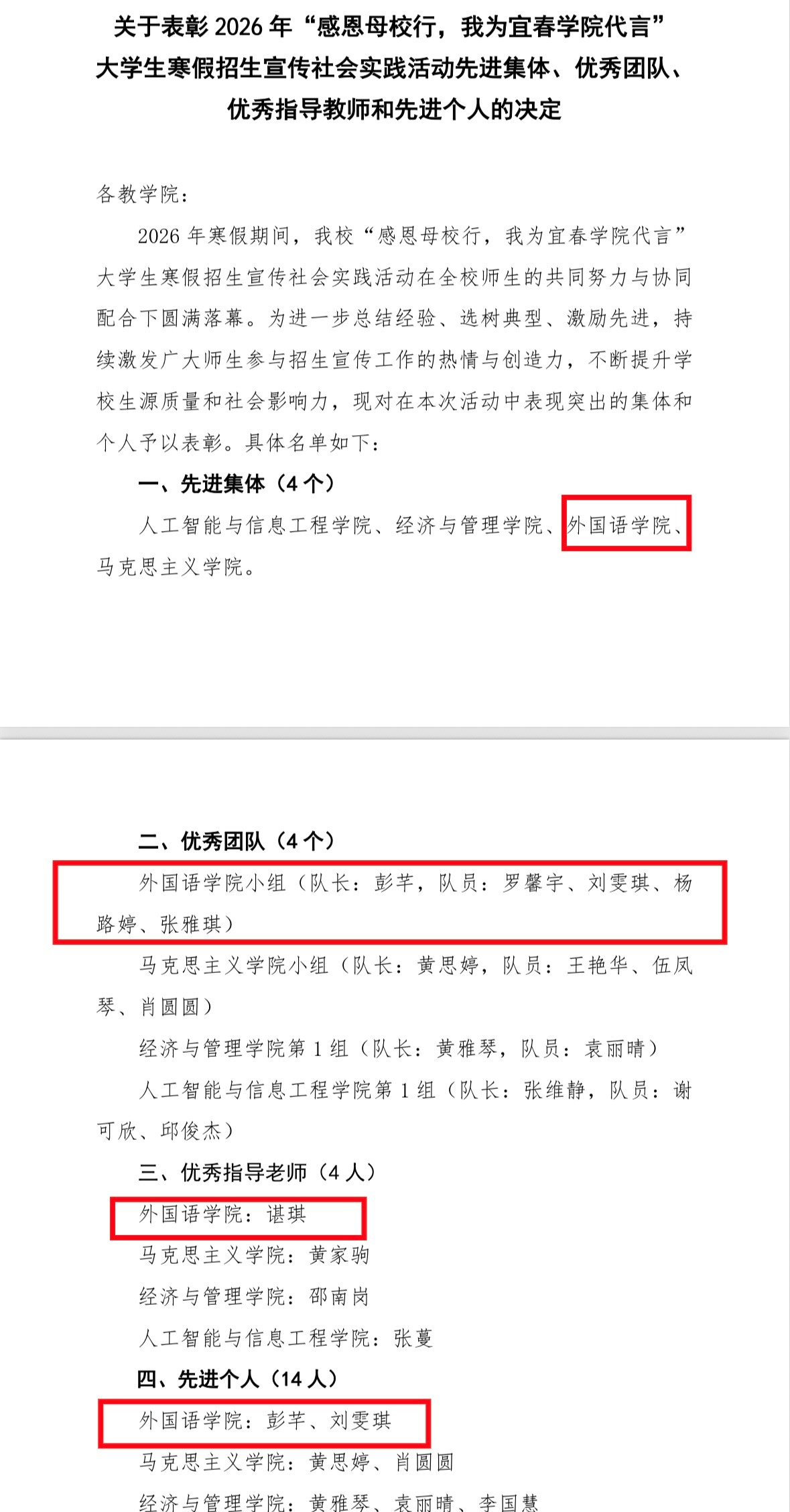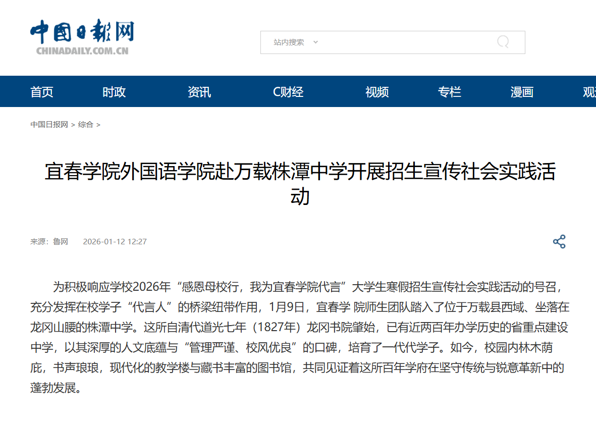 近日,宜春学院2026年“感恩母校行,我为宜春学院代言”大学生寒假招生宣传社会实践活动表彰名单正式公布。我院凭借扎实的组织工作和突出的实践成效,荣获“先进集体”称号,学院师生在优秀团队、优秀指导教师、先进个人等多个奖项中均有优异表现。本次活动的相关报道已在中国日报网发布,获得广泛关注。