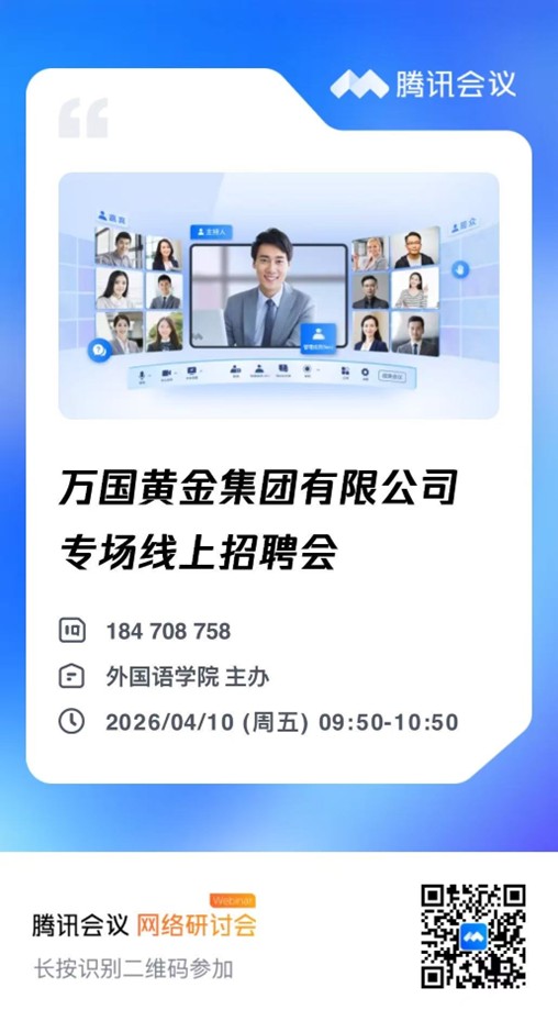 为深入推进就业育人工作,搭建毕业生与用人单位精准对接的桥梁,拓宽毕业生就业渠道,410日上午,外国语学院通过腾讯会议平台成功举办万国黄金集团有限公司专场线上招聘会。本次招聘会邀请到万国黄金集团招聘负责人龚群峰先生担任主讲嘉宾,2026届部分毕业生参与了本次线上招聘活动。