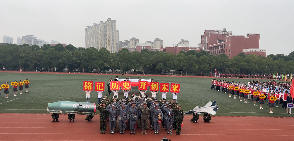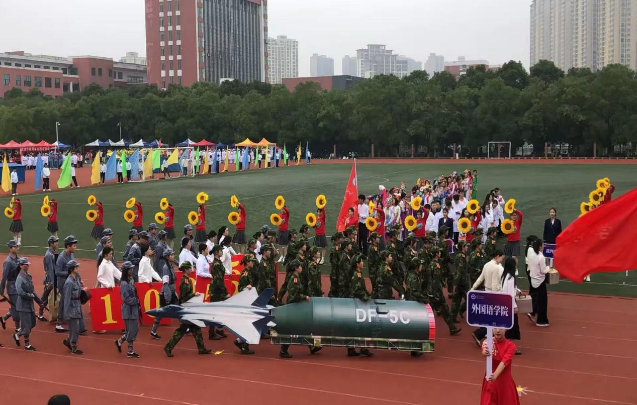 方阵队伍中,学子们身着迷彩军装,身姿挺拔、步履铿锵,宛如一个个坚毅的“小小军人”。“DF - 5C”模型道具的亮相极具冲击力,既体现了外院学子对国防科技发展的关注,更传递出“心系家国、致敬国防”的真挚情怀。红色旗帜在队伍中猎猎作响,是外院学子奋勇向前的精神图腾;而队列旁,手持向日葵的学子们笑容明媚,红裙引导员仪态万方,刚柔并济的画面,生动诠释了外院学子“刚毅与温柔并存,担当与活力共生”的精神特质。