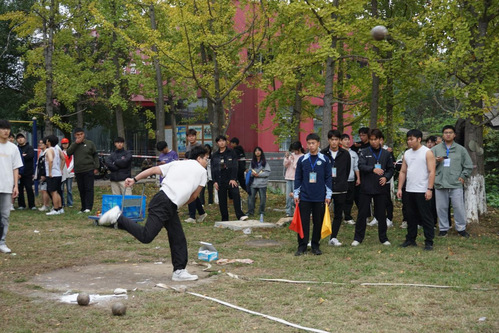 在普通学生组男子铅球预决赛中,外国语学院陈魏涛同学和陈江华同学在热身区积极做准备工作,眼神中充满了自信与坚定。随着裁判一声令下,他们双手紧握铅球,稳稳置于锁骨处,身体微微后倾,目光紧紧锁定投掷方向。助跑、转身、发力、投掷!一系列动作连贯流畅,充满了力量之美。铅球如一颗流星般划破天际,带着他们的期待与努力,更带着外国语学院的荣誉,在空中划出一道优美的抛物线,最终重重落地,激起一片沙土。