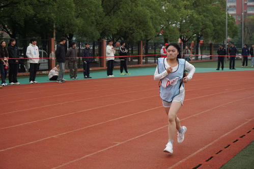随后让我们目光聚焦到普通学生组女子1500米赛道上,这是速度与耐力的双重考验,更是意志与勇气的终极比拼。随着发令枪“砰”的一声响,外国语学院周紫夏同学如离弦之箭般冲出起跑线,迅速调整节奏,在赛道上奋力冲刺。外国语学院刘惠萍同学也同样表现出色,踏在红色跑道上的每一步都是对自己的挑战,对体育精神最好的诠释。外国语学院的啦啦队员们在看台边,在跑道旁为她们加油呐喊,加油声此起彼伏,响彻赛场,让外国语学院运动健儿们更有冲劲!
