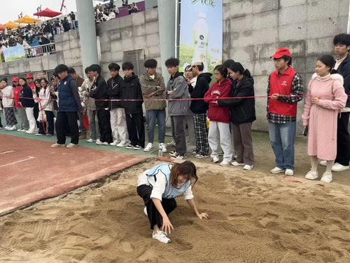 在普通学生组女子跳远比赛中,外国语学院肖春华同学、刘雯琪同学和蒋子艳同学一起为外国语学院争荣。她们目光坚定地锁定起跳点,随后迈着矫健的步伐加速冲刺。风拂过发丝,汗水浸湿衣衫,却挡不住她们前进的脚步。临近起跳点,她们猛地蹬地,身体如轻盈的飞燕般腾空而起,在空中舒展身姿,划出一道优美的弧线。紧接着,她们稳稳落地,激起沙坑中一片金黄的沙浪。