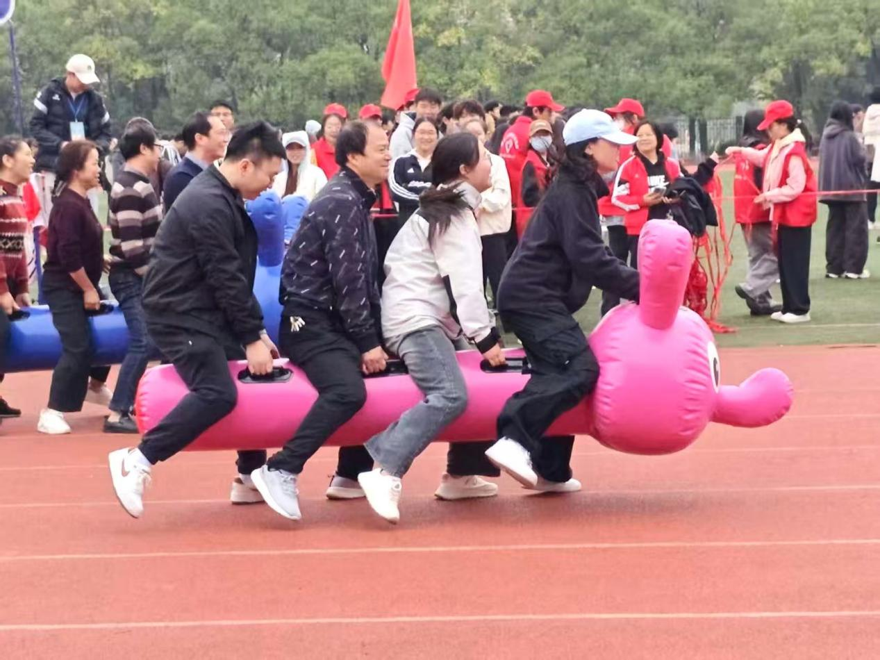 趣味项目区热闹非凡,集体合作尽显团结精神。教职工男女混合组毛毛虫竞速赛场上,教职工代表们组成“毛毛虫”战队。伴随着整齐的口号,大家同步屈膝、迈步,协同向前冲刺。比赛过程中,笑语声此起彼伏,教职工们在协作竞速里感受运动乐趣,展现出活力满满的一面!普通学生男女混合组同心鼓项目里,学生们十几双手紧握绳索,目光紧盯着空中的排球,鼓面每一次精准的起落,都离不开队员间的默契配合与及时调整。在这里,没有单独的“冠军”,只有齐心协力的“我们”,“团结”的运动精神被演绎得淋漓尽致。
