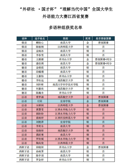 (外国语学院 曾利霞、谢丽梅)近日,2025“外研社·国才杯”“理解当代中国”全国大学生外语能力大赛江西省复赛(多语种组)圆满落幕。在全省众多参赛选手的激烈角逐中(本次江西赛区共设3金、4银、5铜),我院学子表现亮眼、脱颖而出:23级法语班刘艳萍同学凭借扎实功底斩获银奖,22级法语班付莉同学以全省第二名的优异成绩勇夺金奖,将代表我校晋级全国总决赛。