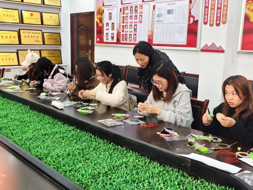 活动以非遗宋锦手工制作为纽带,将党建文化、非遗传承与民族团结有机融合。在简短的宋锦文化科普后,学生党员与少数民族同学分组协作,共同制作宋锦珍珠风铃。穿针引线、搭配组装间,大家互帮互助,交流各自民族的手工艺特色。来自25级法语班的瑶族学生龙素瑶兴奋地说:“第一次亲手触摸宋锦,感觉特别精致!这样的活动让我更爱中华文化了。”24级的苗族学生向粤也感慨:“和党员学长学姐一起做手工,像家人一样温暖,真正体会到了‘民族团结一家亲’。”
