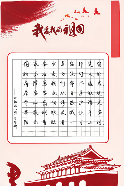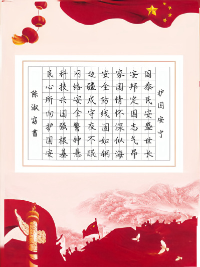 这幅书法作品以“护国安宁”为主题,书写了彰显家国情怀的诗句,既展现了工整清秀的书写功底,更传递出对国家安全的重视、对家国安定的守护之心与赤诚的爱国情怀。