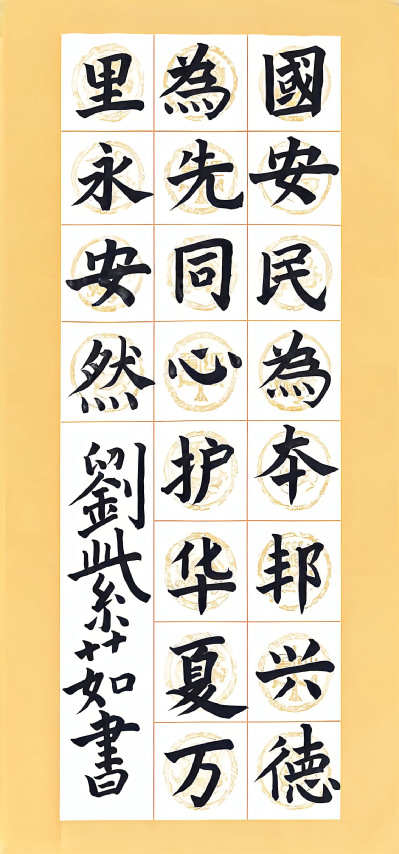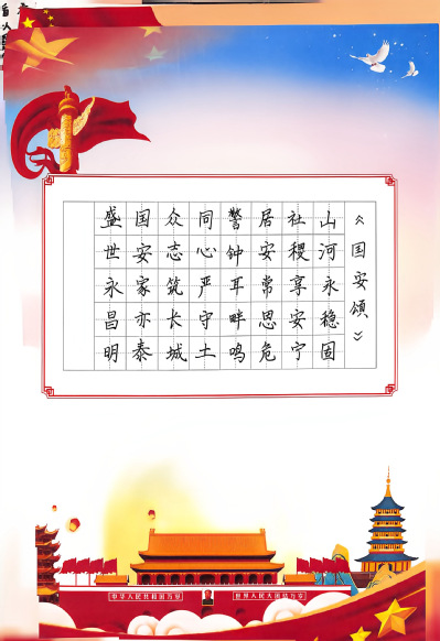 这幅作品以笔墨寄情,将“国安”二字深深刻入字里行间。国以民为本,民以安为先,守护家国安宁,从来不是一句口号,而是我们每个人心中不变的坚守。作为新时代青年,我们更应心怀家国、同向同行,以行动守护华夏万里,以信念筑牢国安防线,让国泰民安的美好图景,在岁月长河中永续流淌。