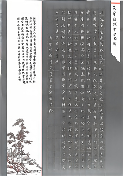 这幅作品的主题为“筑牢防线,守护家国”,以国家安全为核心立意。阐述了国家安全是民族复兴的根基、社会稳定是国家强盛的前提,强调青年责任与全民守护的重要性,将思政主题与书法艺术融合,格调清雅庄重,既传递了家国情怀,也展现了青年学子的担当与素养。