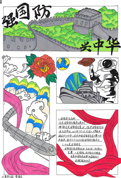 这幅手抄报以“强国防·兴中华”为核心,用长城、航天、高铁等元素串联起传统与现代的国防力量,搭配国家安全科普知识,以手绘之笔绘,彰显全民共筑安全屏障的决心,传递出“以强国防筑国安,以兴中华护万家”的坚定信念。