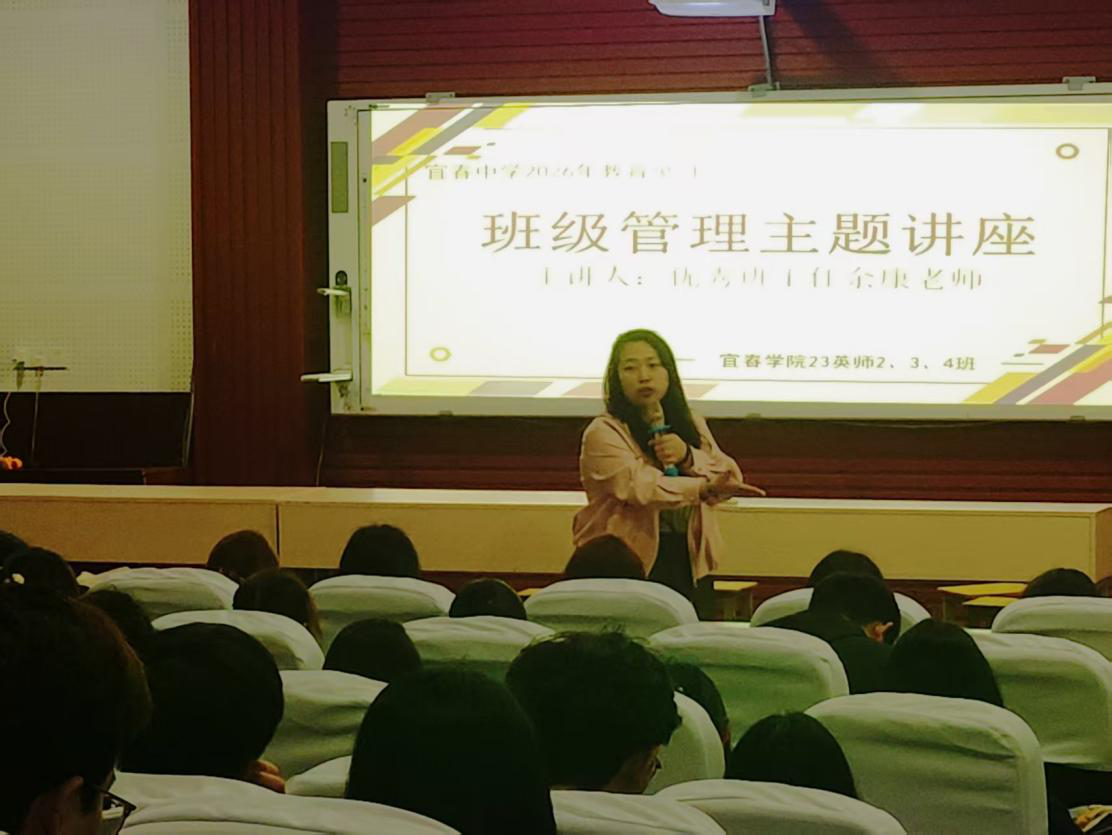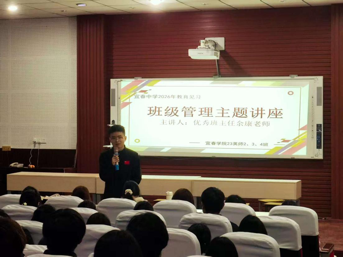 为深化师范生教育见习成效,搭建优秀校友与在校学子的交流平台,4月15日上午10时,我院赴宜春中学教育见习队伍特邀我院优秀毕业生、宜春中学优秀班主任余康老师做班级管理主题讲座。讲座在宜春中学弘毅楼阶梯报告厅举行。2023级英语专业2、3、4班见习学生及副院长袁翔华等指导老师到场聆听。讲座由李慧懿老师主持。